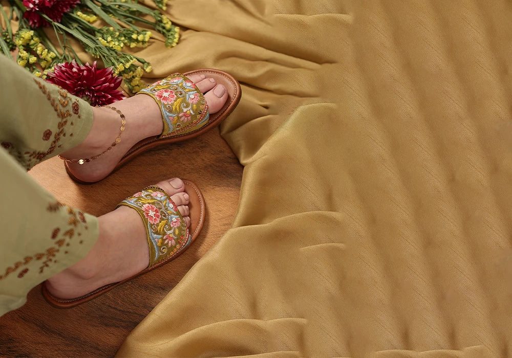 Step into fresh style with these elegant green embroidered mules. The vibrant green base is beautifully adorned with intricate floral and possibly geometric embroidery, accented with shimmering details that add a touch of artistic charm. The comfortable slip-on style makes them perfect for everyday wear, while the detailed artistry ensures they stand out. These mules are ideal for adding a refreshing pop of color and elegant flair to your ethnic or contemporary looks, suitable for various events and comfortable for the climate in Uttar Pradesh.
